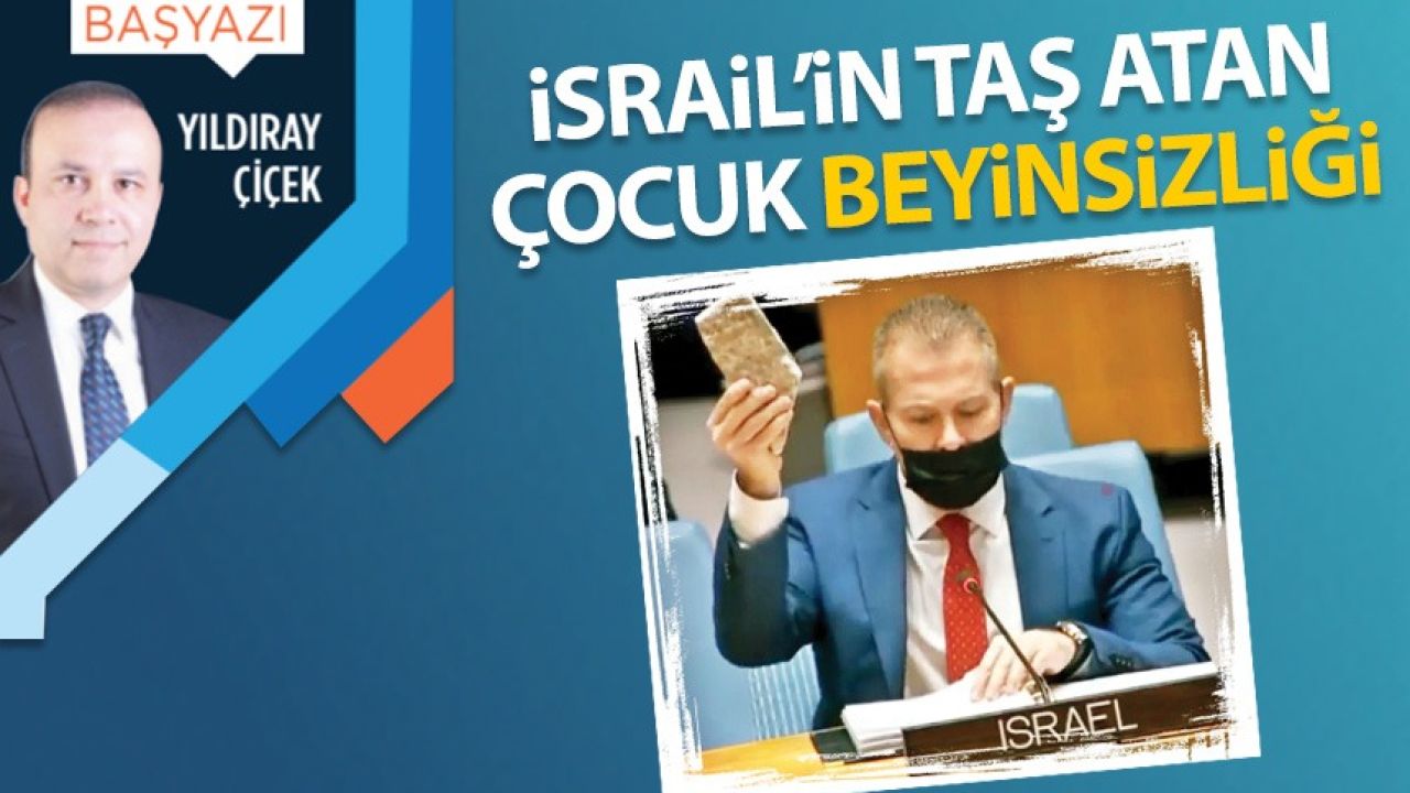 İsrail’in BM temsilcisinin konuşması geçtiğimiz gün dünya medyasına haber oldu. Beyni alınmış İsrail temsilcisi diyor ki: "Çocukları ve kadınları neden bombalayıp öldürdüğümüzü bilmek istiyor musunuz? İşte bu taş yüzünden. Her gün bize bu taşlardan atıyorlar. Siz olsanız ne yapardınız?"