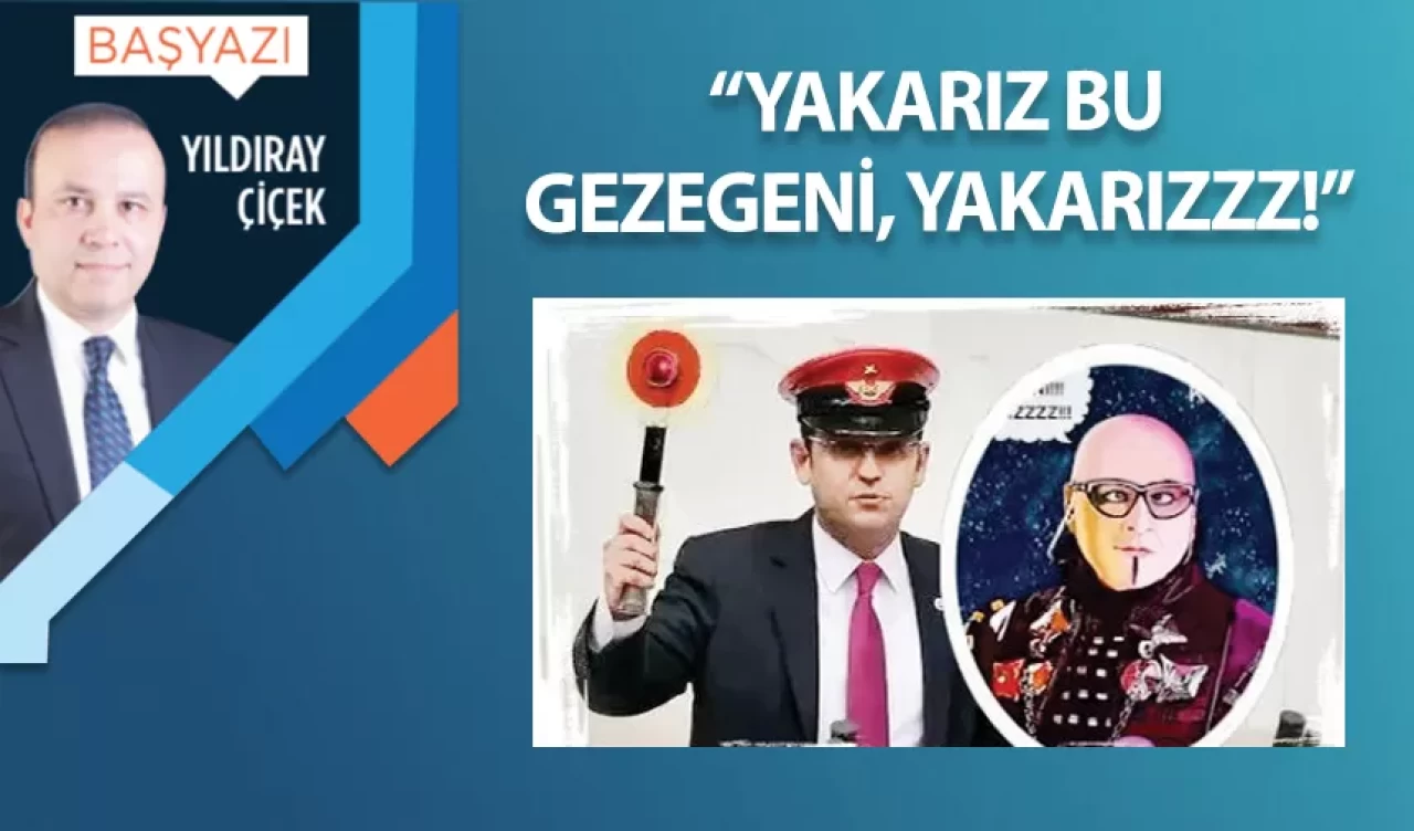Özgür Özel’in tavırları, adeta Cem Yılmaz’ın G.O.R.A. filmindeki “Yakarız bu gezegeni, yakarızzz!” diyen Komutan Logar’ın yaveri Kuna’yı anımsatmaktadır.