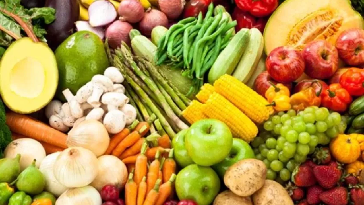 Taze meyve ve sebzeler: Elma, muz, avokado, lahana, havuç, pancar gibi çiğ tüketilebilen besinler ön plandadır.