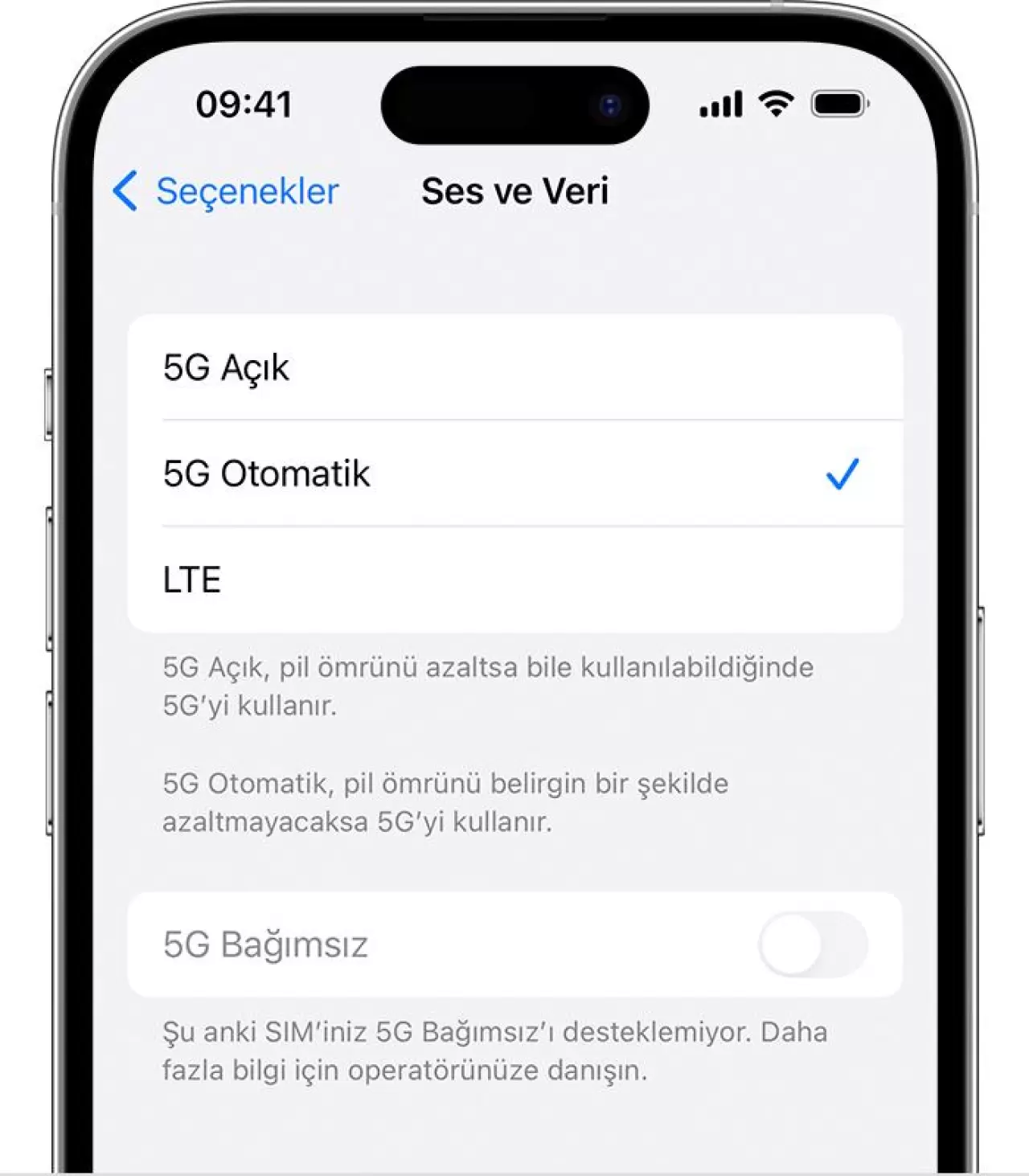 - LTE seçeneğini işaretleyerek 5G'yi kapatabilir veya 5G Otomatik moduna alarak pil ömrünü optimize edebilirsiniz.