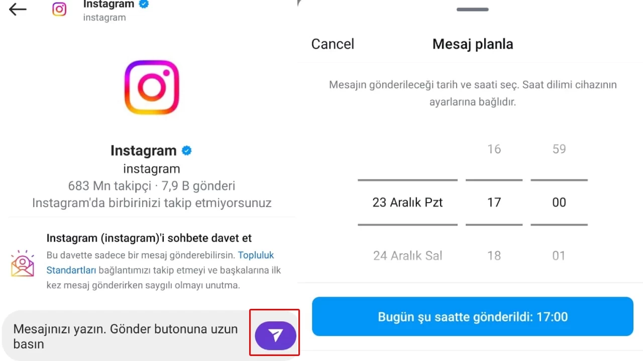 Karşınıza çıkan ekranda, mesajınızı göndereceğiniz tarih ve saati seçebilirsiniz. Instagram mesaj zamanlama özelliği ile mesajınızı en fazla 29 gün ilerisine kadar planlayabilirsiniz. - Mesajınızı Zamanlayın: