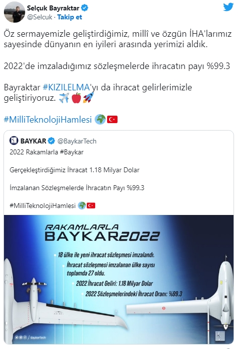 Yerli ve milli SİHA'ları geliştiren Baykar'ın 2022 yılında yaptığı ihracatları Selçuk Bayraktar açıkladı. Bayraktar, "2022'de imzaladığımız sözleşmelerde ihracatın payı %99.3. Bayraktar Kızılelma'yı da ihracat gelirlerimizle geliştiriyoruz" ifadesini kullandı.