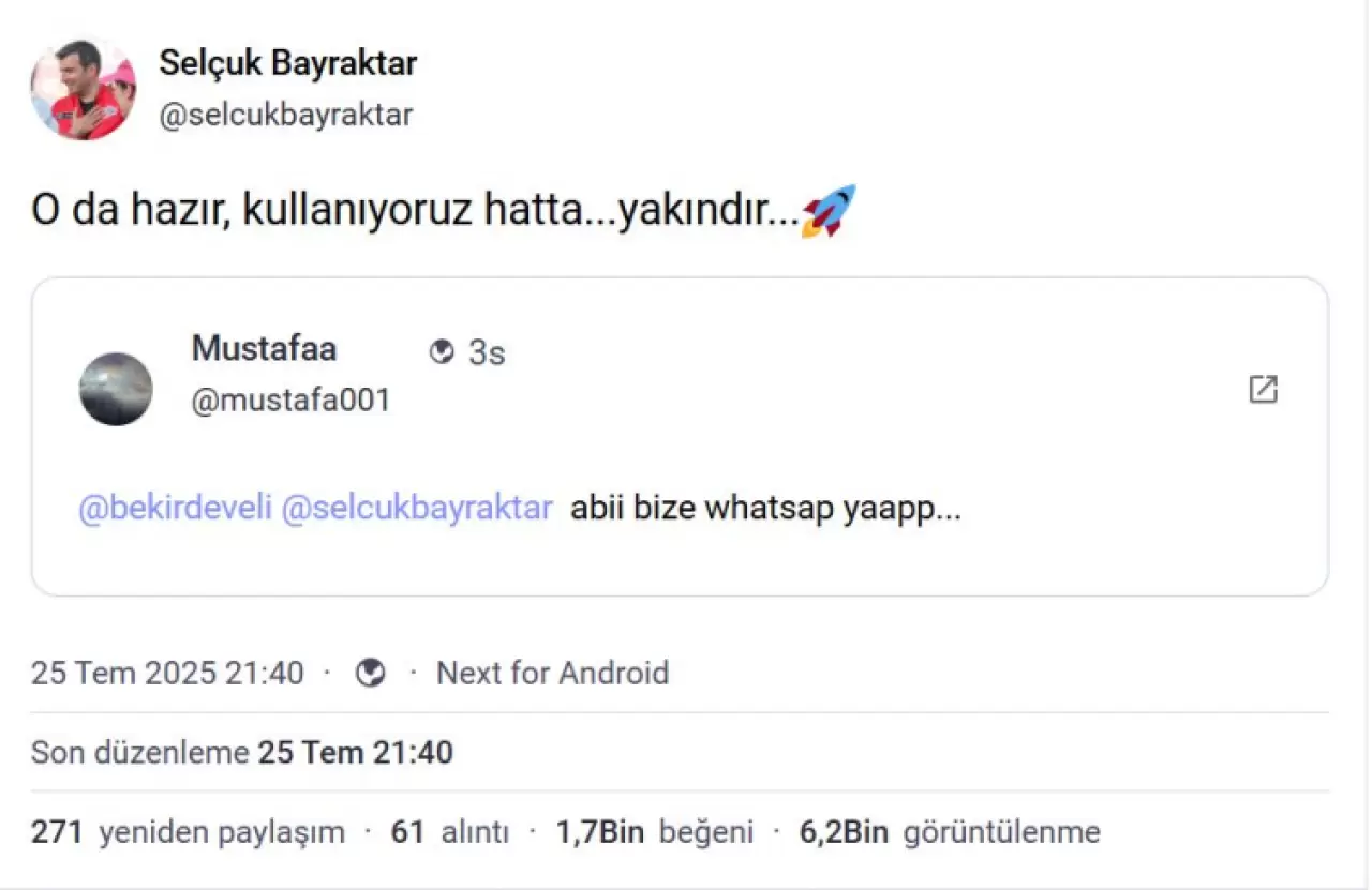 Bir kullanıcının "Abi bize Whatsapp yap" mesajını alıntılayan Bayraktar, "O da hazır, kullanıyoruz hatta...yakındır..." ifadelerini kullandı.