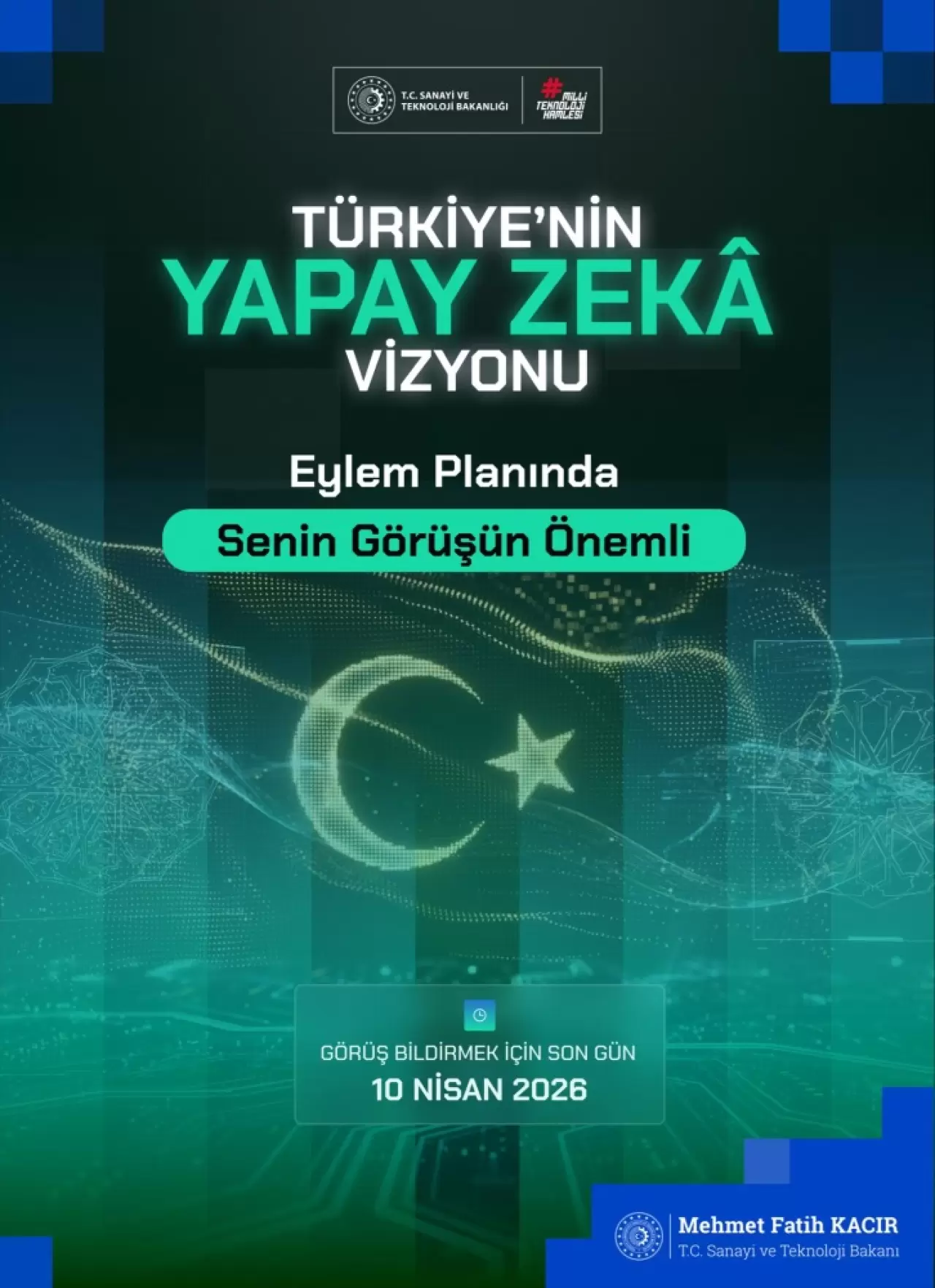 "Tüm vatandaşlarımıza açık olan bu süreçte paylaşacağınız fikirler, ülkemizin yapay zeka alanındaki stratejik önceliklerinin belirlenmesine, fırsatların etkin şekilde değerlendirilmesine ve somut adımların hayata geçirilmesine katkı sunacak. Hedefimiz, Türkiye'yi yapay zeka teknolojilerinde tasarlayan, üreten ve küresel ölçekte rekabet eden, güçlü altyapıya sahip öncü ülkelerden biri haline getirmek. Görüş ve öneriler, 10 Nisan'a kadar, 'yapayzekavizyonu.sanayi.gov.tr' adresi üzerinden iletilebilecek."