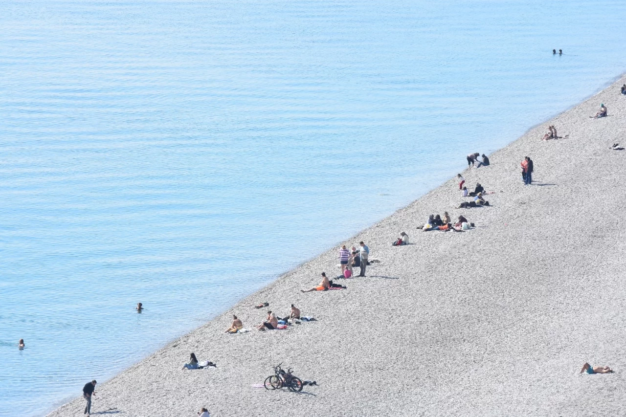 Konyaaltı Sahili'nde birçok kişi güneşlendi, bazıları da denize girmeyi tercih etti.