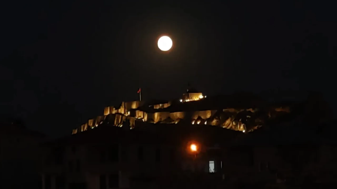 Van'da dolunayın tarihi Van Kalesi ile birleşmesi muhteşem bir manzara sundu. Şehrin birçok yerinden izlenen bu görüntü, fotoğraf tutkunlarını cezbetti.
