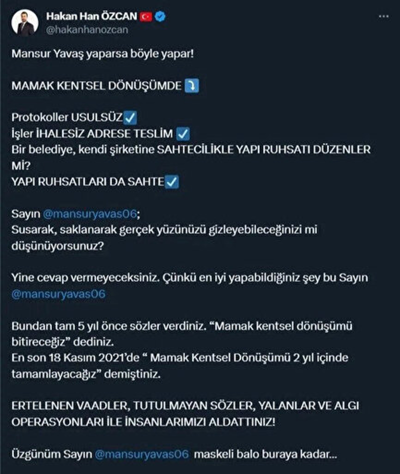 AK Parti Ankara İl Başkanı Hakan Han Özcan, sosyal medya hesabından, 2021'de Mamak'ta kentsel dönüşümü bitirme sözü veren Ankara Büyükşehir Belediye Başkanı Mansur Yavaş'ın Mamak Kentsel Dönüşüm projelerinde bir türlü bir adım atamamasını eleştirdi ve projelerdeki usulsüzlükleri sıraladı.