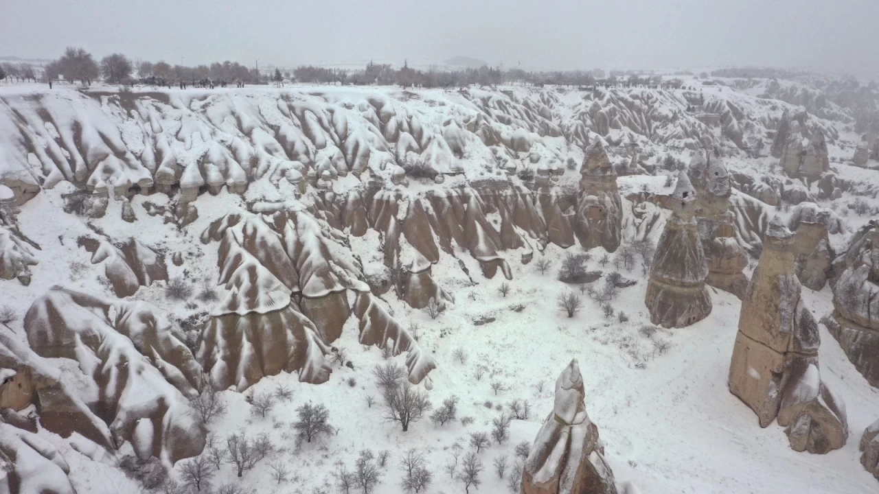 Peribacaları, Kapadokya'nın karla kaplanmasıyla turistlerin ilgisini çekti. Bölgede geçen haftadan beri devam eden kar yağışı, tarihi ve doğal güzellikleriyle ünlü Kapadokya'nın beyaz örtüyle kaplanmasına neden oldu. Kar yağışı, bölgenin her mevsimde cazibe merkezi olmasını sağlayan bir başka güzellik olarak karşımıza çıktı.
