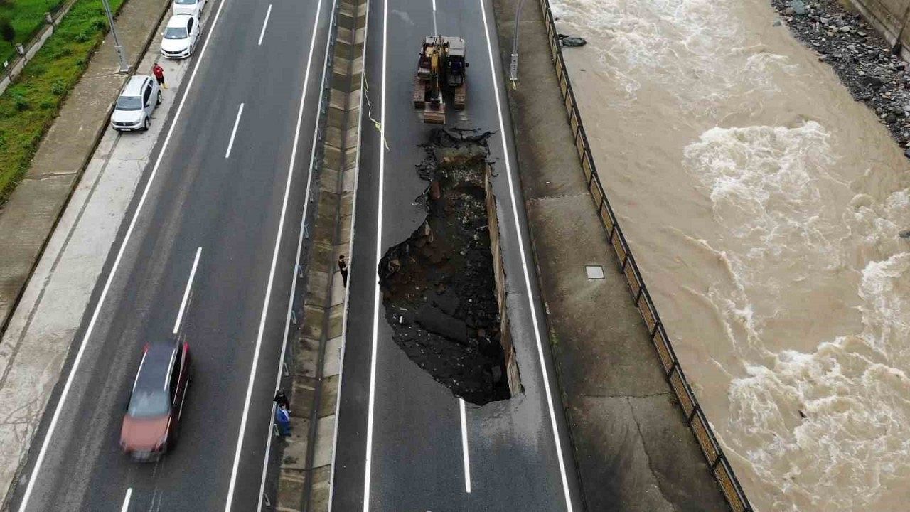 Rize’de dün akşam saatlerinde etkili olan yağmurdan ötürü Rize’den Güneysu istikametine giden karayolunda yaklaşık 5 metre genişliğinde, 2 metre derinliğinde bir çukur oluştu. Daha önce de çökme yaşanan yoldan olay anında aracın geçmemesi büyük bir faciayı önledi. Rize-Güneysu istikametindeki yol trafiğe kapatılırken Güneysu istikametinden Rize istikametine gelen yol ise farklı bir güzergahtan sürdürülüyor. Bugün sabah saatlerinden itibaren de karayolları ekipleri yol çalışmalarına başladı. Çökmenin meydana geldiği yol havadan görüntülendi.