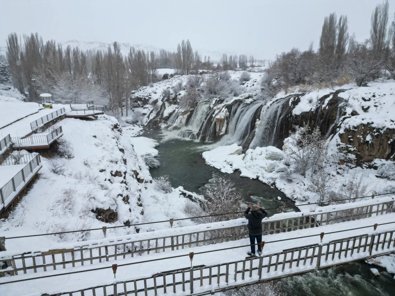 Muradiye Şelalesi ve çevresindeki kar manzarası, dronla havadan görüntülendi. Beyaz örtüyle kaplanan şelale, doğa tutkunları ve fotoğraf meraklıları için büyüleyici kareler sundu.