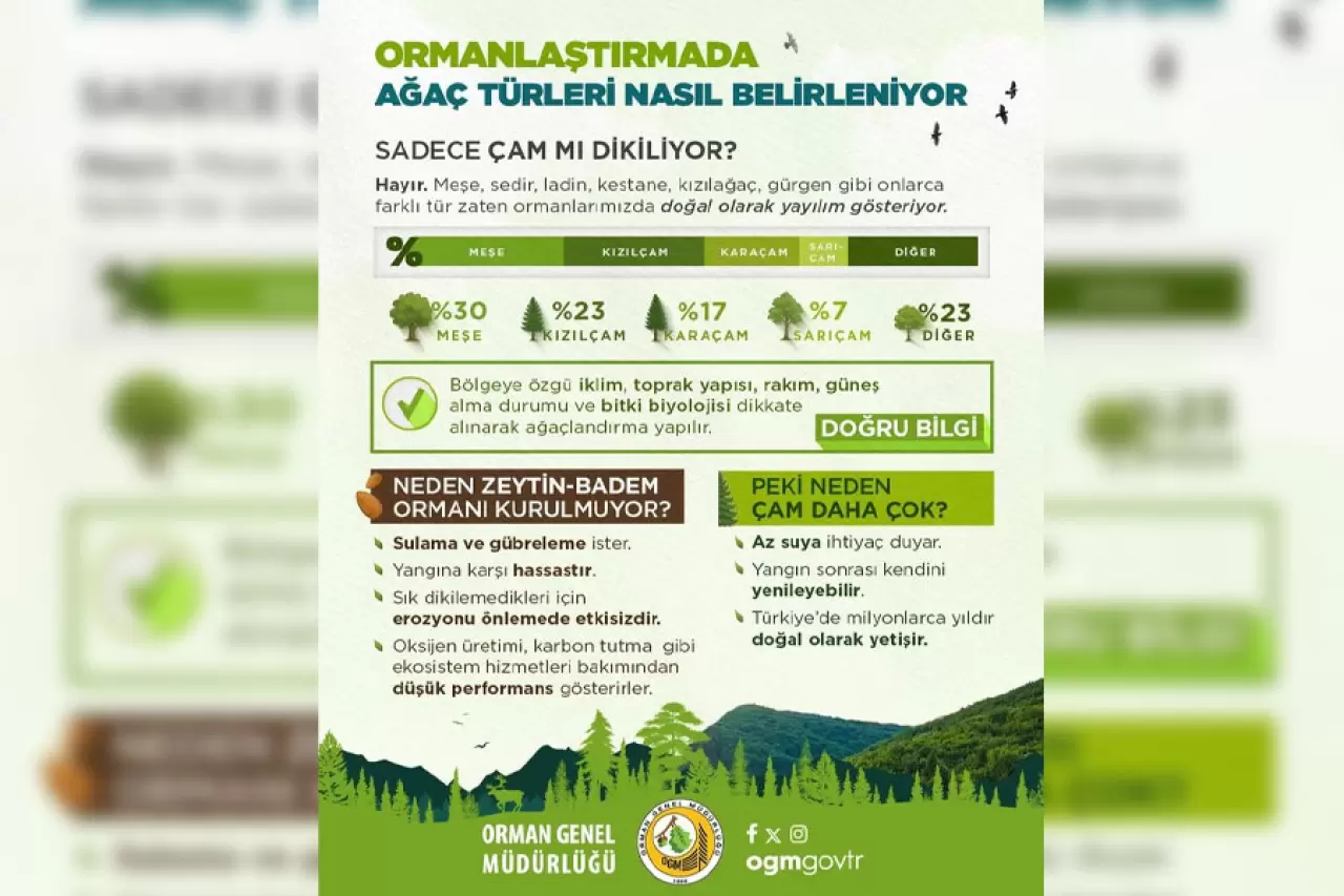 Zeytin, badem ve benzeri meyveli türlerin tek başına orman oluşturmadığı vurgulanan açıklamada, "Bu türlerin su, gübre ve bakım ihtiyacı fazladır; erozyon önleme ve oksijen üretme gibi ekosistem hizmetleri sınırlıdır. Gelir Getirici Tür Eylem Planlarımız kapsamında; zeytin, badem, ceviz gibi türler, orman köylerimizin ekonomisine destek olması amacıyla belirlenen alanlarda dikilmektedir. Türkiye Cumhuriyeti Anayasası’nın 169’uncu maddesi uyarınca; yanan orman alanları yeniden ağaçlandırılır ve başka amaçla kullanılamaz" denildi.