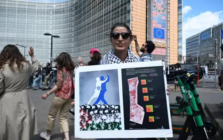 Schuman Meydanı'nda toplanan kalabalık, AB'nin Gazze'ye yönelik politikasını protesto ederek AB-İsrail arasındaki ortaklık anlaşması ve üye ülkelerden yapılan silah satışlarının "insan haklarına saygı" şartına bağlanmasını istedi.