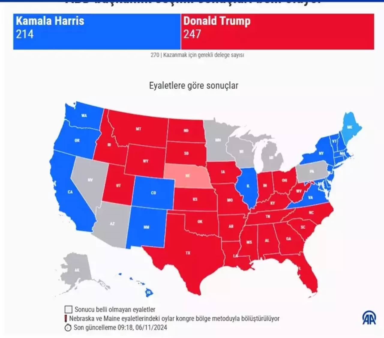 Resmi olmayan sonuçlara göre TSİ 09.30 itibariyle Kamala Harris 61.565.848 oy (47.4%) oy, 66.396.714 oy (51.1%) oy sayısı ile seçimin son düzlüğüne girdi. New York Times gazetesi de Trump'ın kazanma ihtimalinin yüzde 90 olduğunu belirtiyor.