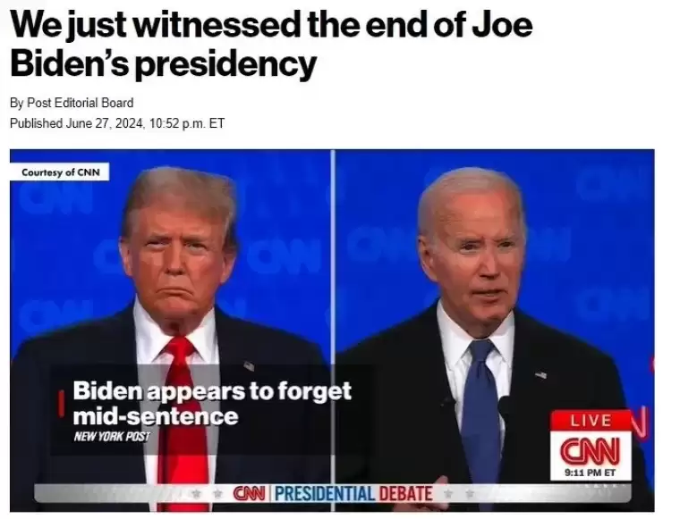 New York Post gazetesi "Tartışma Biden için felaketti" ifadesiyle servis ettiği haberinde Biden'ın başkanlığının sona ermesinin çok yakın olduğunu savundu.