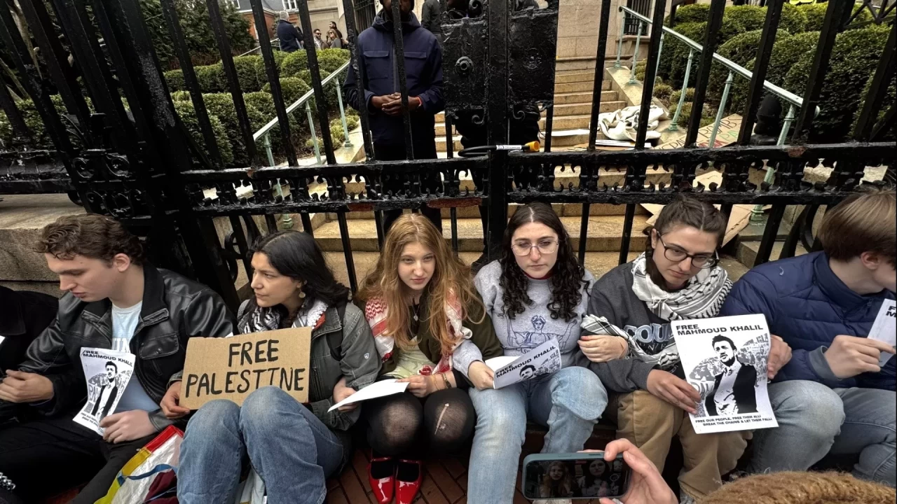 ABD’deki Columbia Üniversitesi'nde Filistin'e destek protestolarının öncülerinden olan öğrenci aktivist Mahmoud Khalil’in ABD Göçmenlik ve Gümrük Muhafaza (ICE) yetkilileri tarafından gözaltına alınması protesto edildi. Bir grup öğrenci, Khalil’in serbest bırakılması için birbirlerine zincirli halde üniversite içerisindeki binaların önünde oturma eylemi başlattı.