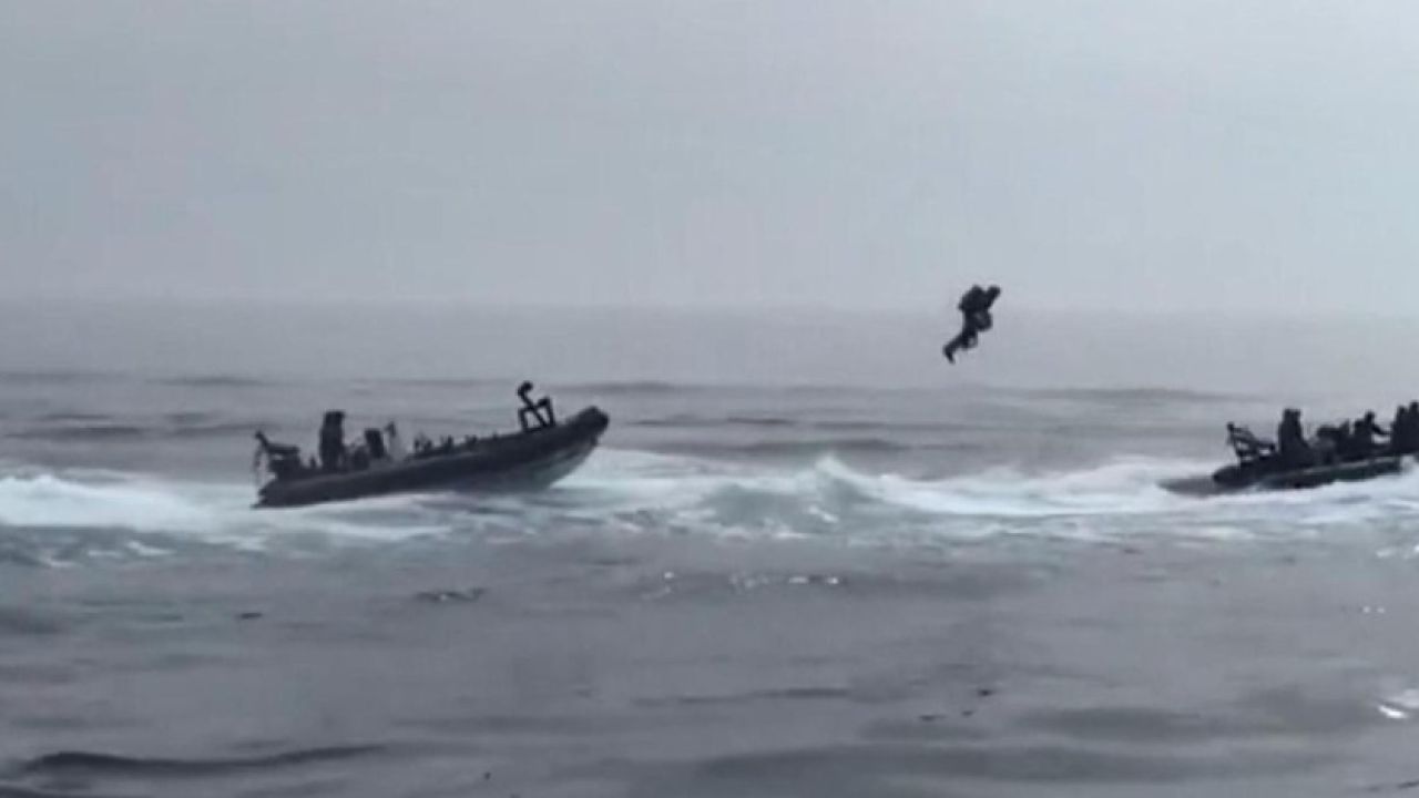 İngiltere'de Kraliyet Donanması'nda görevli askerler tatbikat sırasında sırt roketiyle deneme uçuşu gerçekleştirdi.