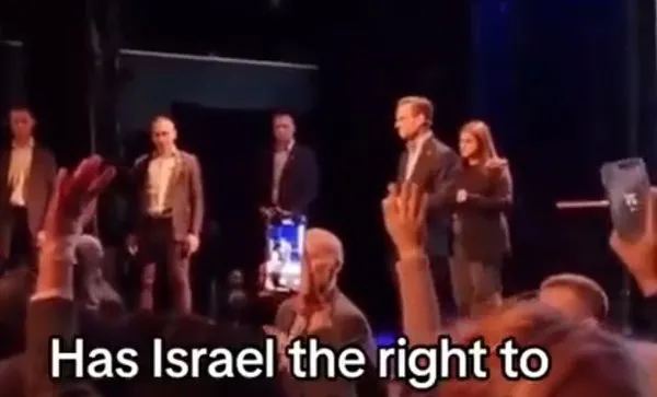"İsrail soykırım yapmakta haklı mı?" sorularına cevap veremeyen Başbakan'a tepki olarak salonda "Özgür Filistin" sloganları yükseldi. Salonda bir kişi, "6 bin Filistinli çocuğun öldürülmesine sessiz kaldığınız için yazıklar olsun" diye bağırdı.