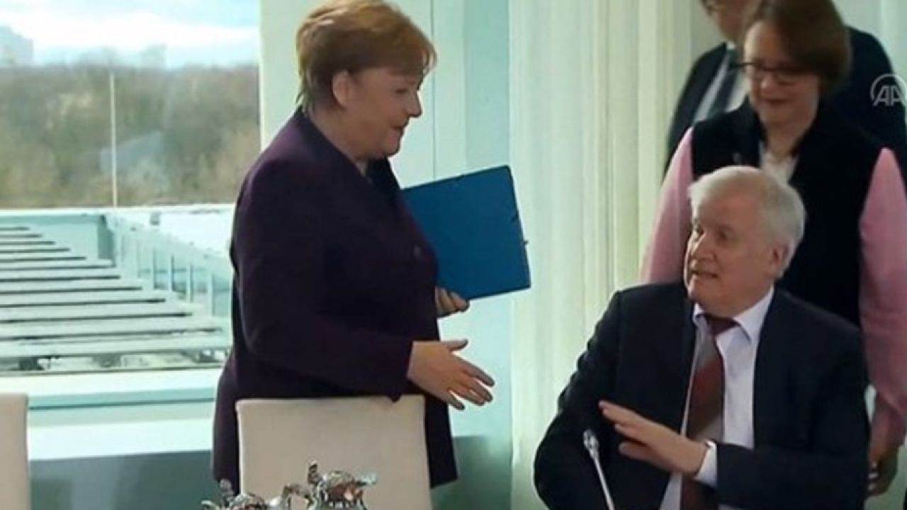 Başbakanlıkta düzenlenen uyum zirvesinde salona giren Merkel, hiç kimseyle tokalaşmadan yerine geçti. Ancak oturduğu yerin hemen yanında İçişleri Bakanı Seehofer'i gören Merkel, bakana doğru elini uzattı. Seehofer ise "Hayır hayır" diyerek Merkel'in kendisine uzattığı eli sıkmadı. Merkel de gülümseyerek, "Sahi, anlıyorum" diyerek koltuğuna oturdu.