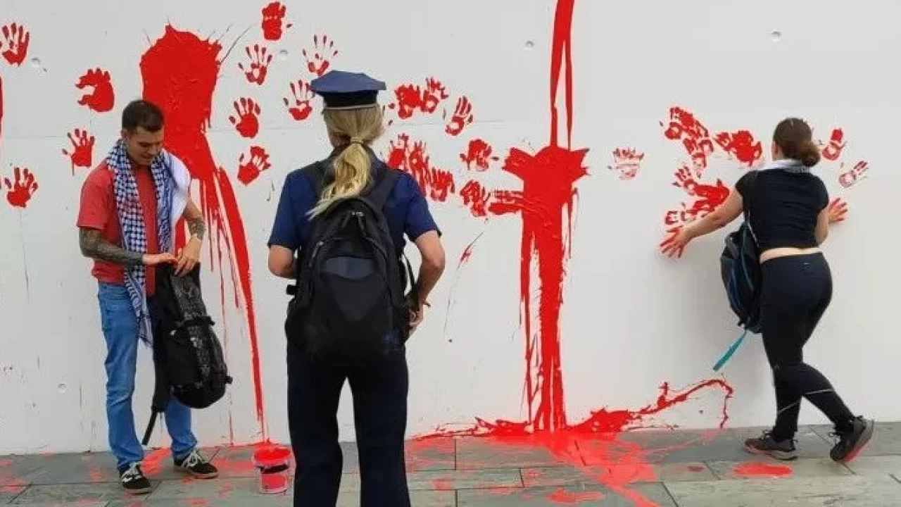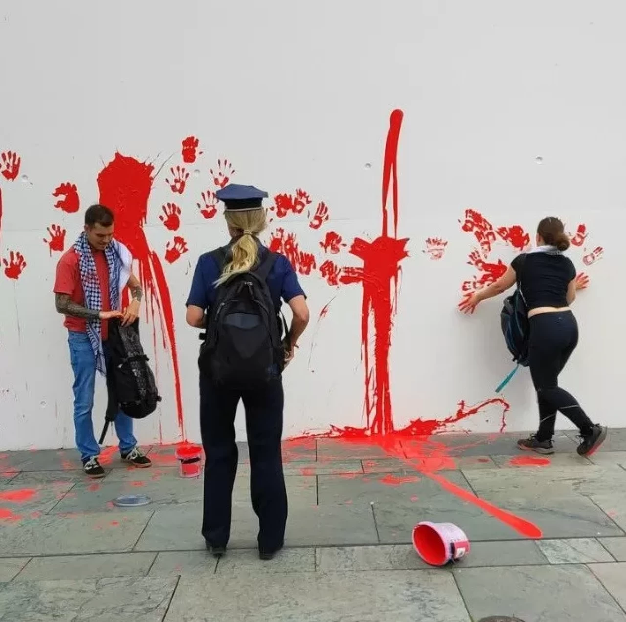 Filistin destekçisi 2 kişi, öğle saatlerinde Almanya’nın başkenti Berlin’de İsrail ve Almanya'yı protesto etti. Yakın zamanda isimlerini değiştiren Neue Generation (Yeni Nesil) adlı grubun üyesi 2 kişi, ellerini yanlarında getirdikleri kırmızı boyaya bulayarak Almanya Başbakanlığı binasının duvarına sürdü. Sosyal medya hesaplarından da eylemlerini paylaşan göstericiler, "İsrail’in 2’nci en büyük tedarikçisi Almanya, Gazze’deki acılardan doğrudan sorumludur" ifadelerini kullandı.