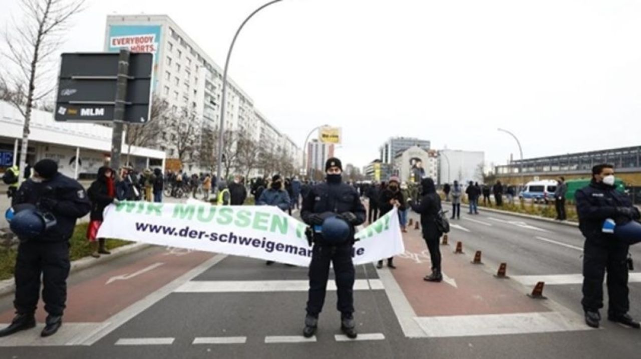 Aşırı sağcı Almanya için Alternatif (AfD) Partisi tarafından Kovid-19 tedbirini protesto etmek amacıyla düzenlenen gösteriye katılan yaklaşık 100 kişi Alexander Meydanı'nda toplandı.