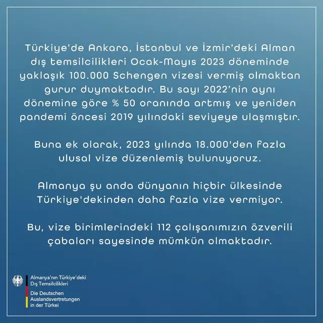 "Türkiye'de Ankara, İstanbul ve İzmir'deki Alman dış temsilcilikleri Ocak-Mayıs 2023 döneminde yaklaşık 100 bin Schengen vizesi vermiş olmaktan gurur duymaktadır. Bu sayı 2022'nin aynı dönemine göre yüzde 50 oranında artmış ve yeniden pandemi öncesi 2019 yılındaki seviyeye ulaşmıştır. Buna ek olarak, 2023 yılında 18 binden fazla ulusal vize düzenlemiş bulunuyoruz. Almanya şu anda dünyanın hiçbir ülkesinde Türkiye'dekinden daha fazla vize vermiyor. Bu, vize birimlerindeki 112 çalışanımızın özverili çabaları sayesinde mümkün olmaktadır."