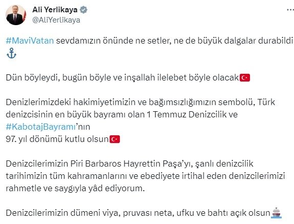 Paylaşımının devamında ise Yerlikaya, Denizlerimizdeki hakimiyetimizin ve bağımsızlığımızın sembolü, Türk denizcisinin en büyük bayramı olan 1 Temmuz Denizcilik ve #KabotajBayramı'nın 97. yıl dönümü kutlu olsun. Denizcilerimizin Piri Barbaros Hayrettin Paşa'yı, şanlı denizcilik tarihimizin tüm kahramanlarını ve ebediyete irtihal eden denizcilerimizi rahmetle ve saygıyla yâd ediyorum" dedi.