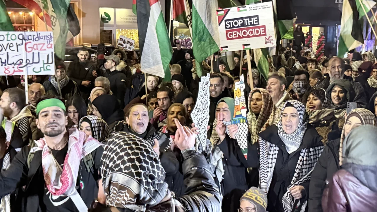 Göstericiler, Filistin bayrakları ile “Soykırımı durdurun”, “İsrail’e silah verilmesin” ve “Almanya ellerini Filistin kanıyla lekeliyor” yazılı dövizler taşıdı. Kalabalık yürüyüş boyunca İsrail karşıtı sloganlar attı.