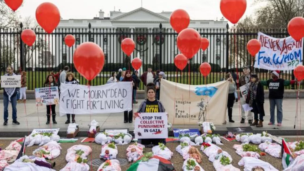 "Ölüm" temalı gösteride aktivist grup, Filistinlilerle dayanışmalarını ifade etmek için İsrail'in saldırılarında hayatını kaybeden çocuklar anısına kefenlenmiş oyuncak bebekleri Beyaz Saray'ın parmaklıklarının önüne bıraktı.