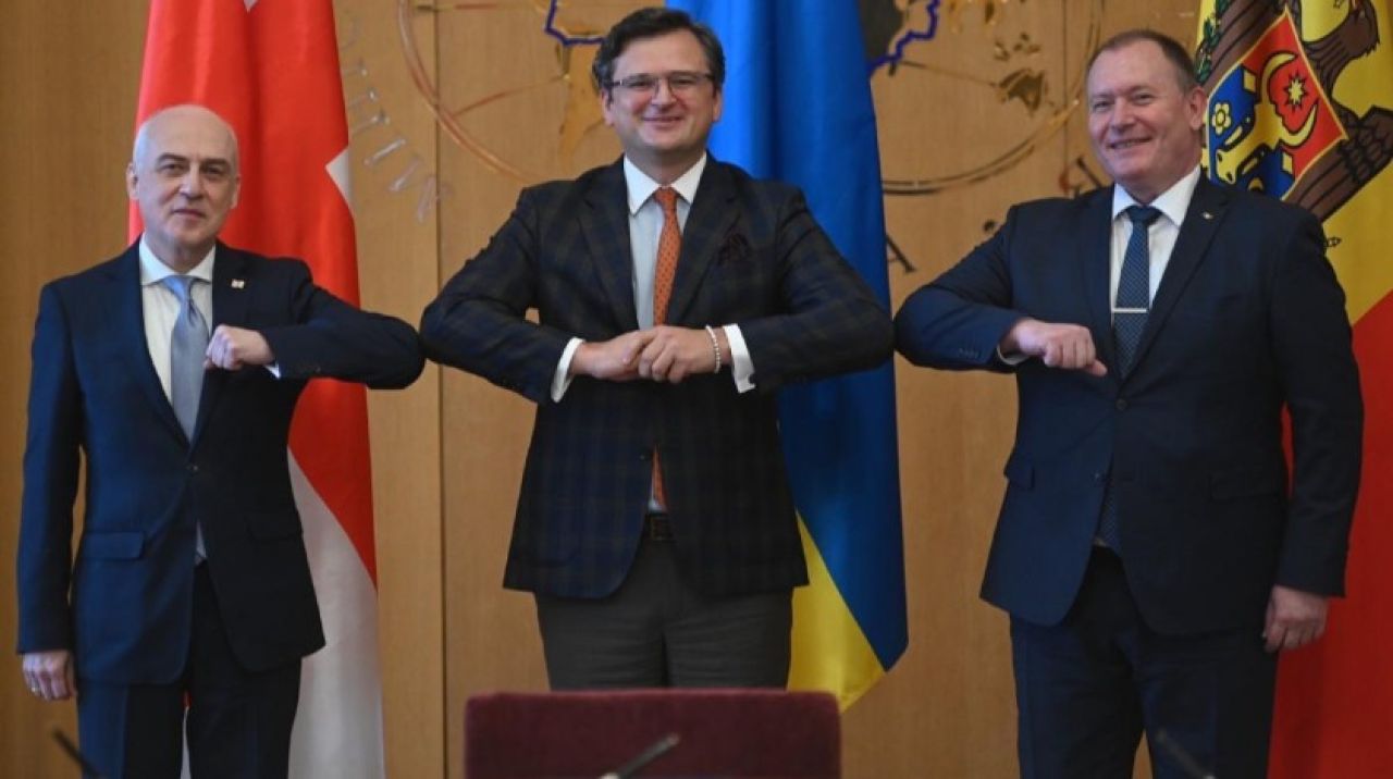 Ukrayna Dışişleri Bakanı Dmitro Kuleba, Gürcistan Dışişleri Bakanı Davit Zalkaliani ve Moldova Dışişleri ve Avrupa Entegrasyonu Bakanı Aureliu Ciocoi Kiev'de anlaşma imzaladıktan sonra basın toplantısı düzenledi.