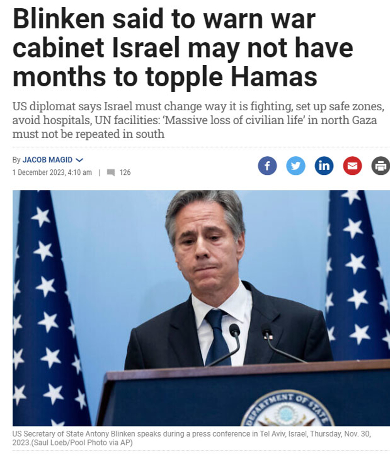 Blinken'ın İsrail'e olan tavrının değiştiğini yazan Times of İsrail gazetesi, ABD'nin Netanyahu yönetimine rest çektiğini öne sürdü. Habere göre Blinken, basın toplantısındaki açıklamalarının aksine İsrail Savunma Bakanı Yoav Gallant'a farklı bir tondan uyarıda bulunarak güneye yönelik saldırılara tepki gösterdi. Blinken, "Kuzey'deki gibi güney bölgesinde faaliyet gösteremezsiniz" dedi.