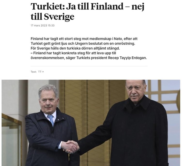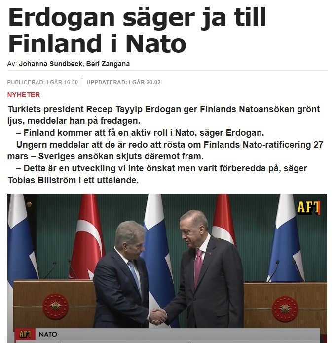Aftonbladet, Finlandiya'nın NATO üyeliğinin kabul edilmesini "İsveç ve Finlandiya ilişkileri NATO tarafından tehdit altında" sözleriyle okuyucularına servis etti.