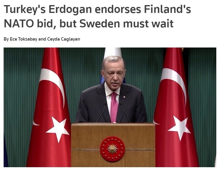 Reuters haber ajansının son dakika koduyla geçtiği ve dünya çapında sayısız medya kuruluşuna servis ettiği haberde ise "Türkiye Finlandiya'nın sürecine onay verse de İsveç hala beklemek zorunda" ifadelerini kullandı. Cumhurbaşkanı Erdoğan'ın sözlerine geniş yer verilirken, İsveç'in teröristlerin iadesini reddinin bu sonucu doğurduğuna da dikkat çekildi.