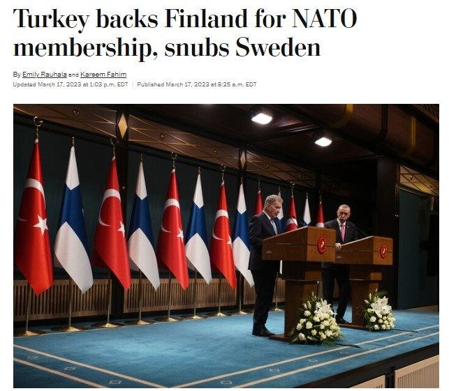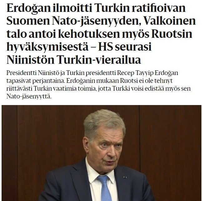 Finlandiya'nın önemli yayın kuruluşlarından olan Helsingin Sanomat, Türkiye'nin NATO onayını manşetten duyurdu. Helsingin Sanomat, Cumhurbaşkanı Erdoğan'ın sözlerine ayrıntılı olarak yer verdiği haberinde "Türkiye, İsveç ve Finlandiya'nın yollarını ayırdı" ifadelerini kullandı.