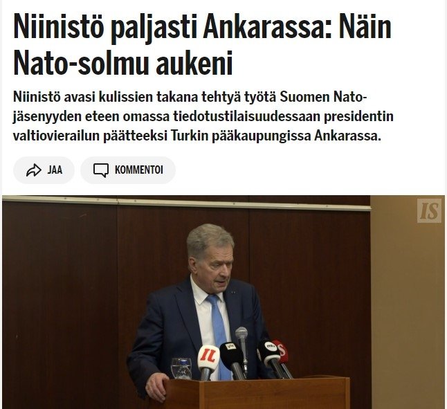Ilta-Sanomat gazetesi, Cumhurbaşkanı Erdoğan'ın açıklamasının ardından konuşan Finlandiya Cumhurbaşkanı Niinistö'nun sözlerini manşetten duyurdu. Finlandiya'nın sürecinin başlatıldığının vurgulandığı haberde "İyi hissettiriyor" başlığı yer aldı. Ilta-Sanomat, Türkiye'nin İsveç'in gerekli şartları yerine getirmediği sürece onay vermemekte kararlı olduğunun da altını çizdi.