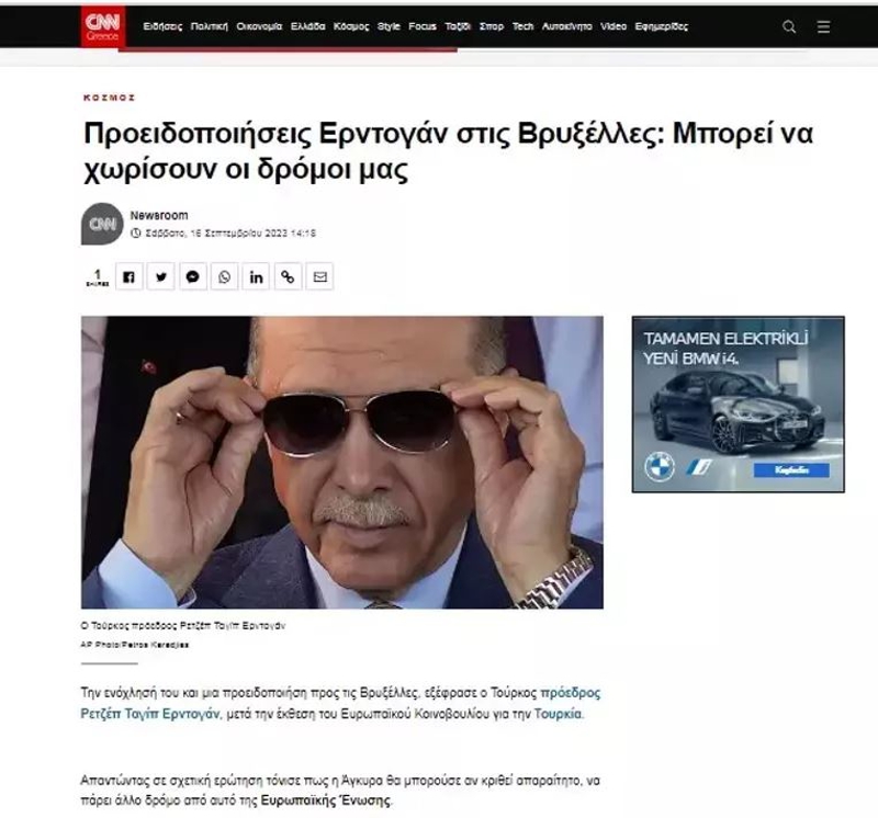 CNN Yunanistan 'Erdoğan Brüksel'i uyardı: Yollarımızı ayırabiliriz' başlıklı haberinde "Türkiye Cumhurbaşkanı Recep Tayyip Erdoğan, Avrupa Parlamentosu'nun Türkiye hakkındaki raporunun ardından rahatsızlığını dile getirerek Brüksel'e uyarıda bulundu. Ankara'nın gerekli görülmesi halinde Avrupa Birliği'nden farklı bir yol izleyebileceğini vurguladı ." ifadelerini kullandı.