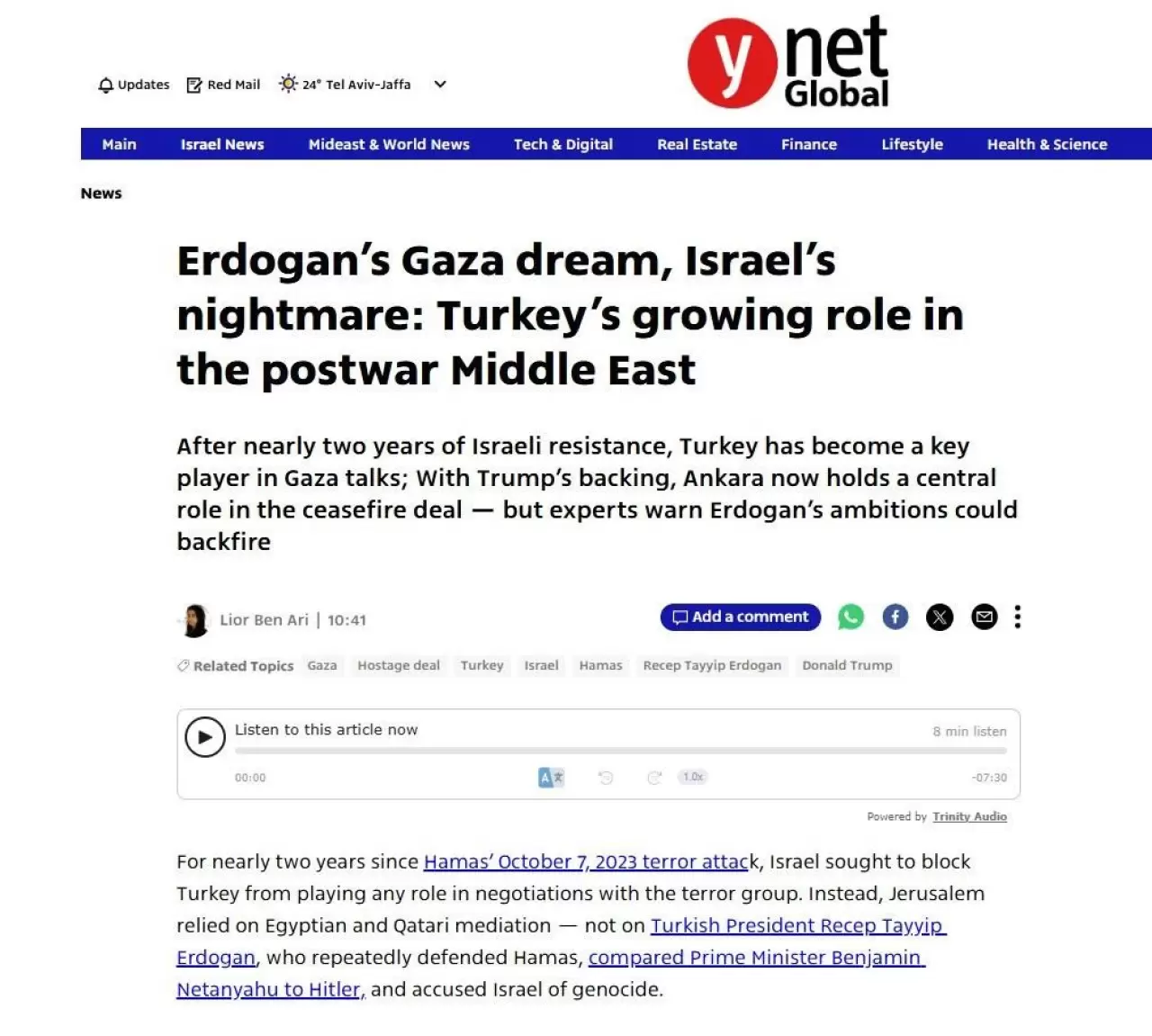 İsrailli yazar Lior Ben Ari, YNet Global'de 18 Ekim 2025 tarihinde, "Erdoğan'ın Gazze Rüyası İsrail'in Kabusu: Türkiye'nin Savaş Sonrası Orta Doğu'daki Artan Rolü" başlıklı bir makale yayınladı.