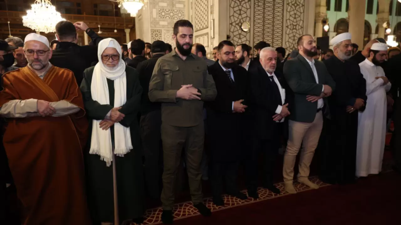Geçen yıl Şam'a girdiği askeri kıyafetle camiye gelen Şara'ya, Dışişleri Esad Hasan Şeybani'nin de bulunduğu bazı bakanlar da eşlik etti.