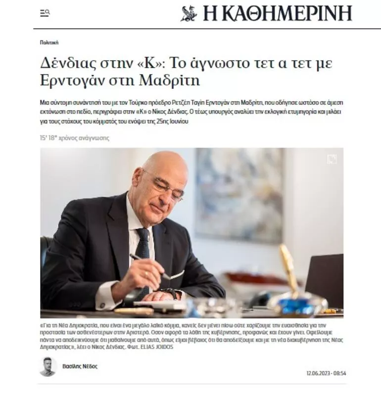 Cumhurbaşkanı Erdoğan'ın 28 Mayıs'ta kazandığı Seçim zaferini ve Türkiye'deki yeni dönemi de değerlendiren Dendias, "Cumhurbaşkanı Erdoğan'ın sadece iç politikada değil, uluslararası ilişkilerde de yeni bir başlangıç yapmaya çalıştığı aşikar. Bu yeni başlangıç noktasının hangi yönde ilerleyeceği konusunda bir sonuca varmak için elbette çok erken. Burada önemli soru Cumhurbaşkanı Erdoğan'ın 21. yüzyıl Türkiye'si için ne istediğidir. Erdoğan'ın Avrupa ve Yunanistan ile yakın ilişkiler arzulayan müreffeh bir Türkiye'nin yönünü seçmesini arzu ederim" ifadelerini kullandı.