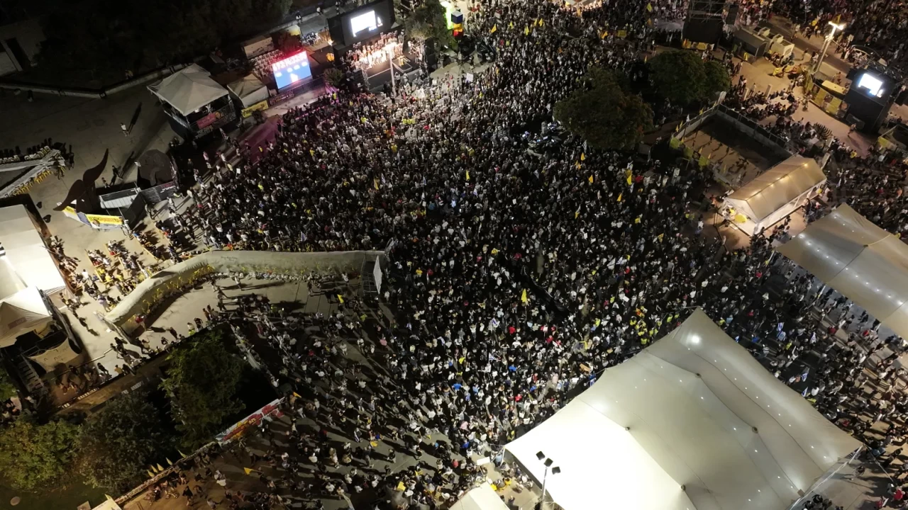 Daha sonra binlerce İsrailli, Tel Aviv'de "Esirler Meydanı" adı verilen alanda, Gazze Şeridi'ndeki İsrailli esirlerin serbest kalması için bir anlaşma yapılması talebiyle toplandı.