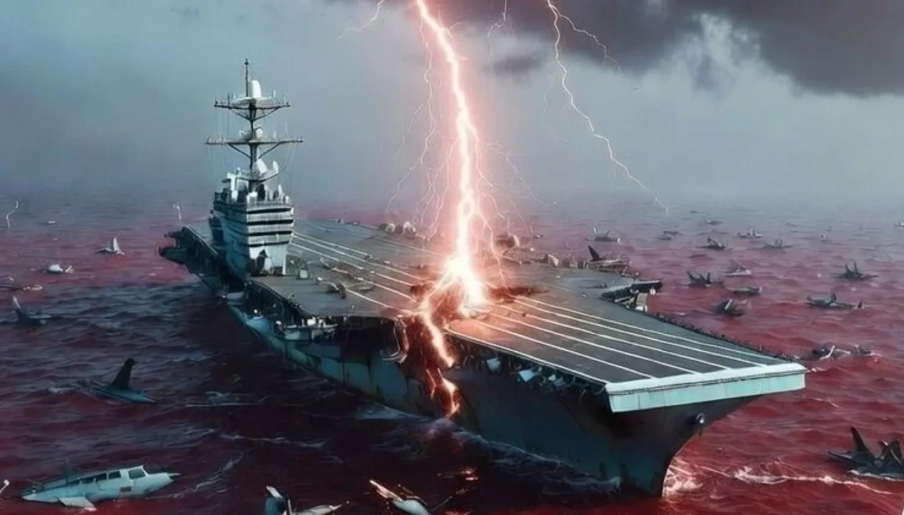 Paylaşımda, uçak gemisine isabet eden bir yıldırımın yanı sıra ABD'ye ait savaş uçaklarının denize düşerek batmış şekilde tasvir edildiği, denize saplanmış kılıç figürlerinin öne çıktığı görüldü. Görselde ayrıca Saf Suresi'nin 13'üncü ayeti olan "Allah'tan bir yardım ve yakın bir fetih" ifadesine yer verildi.