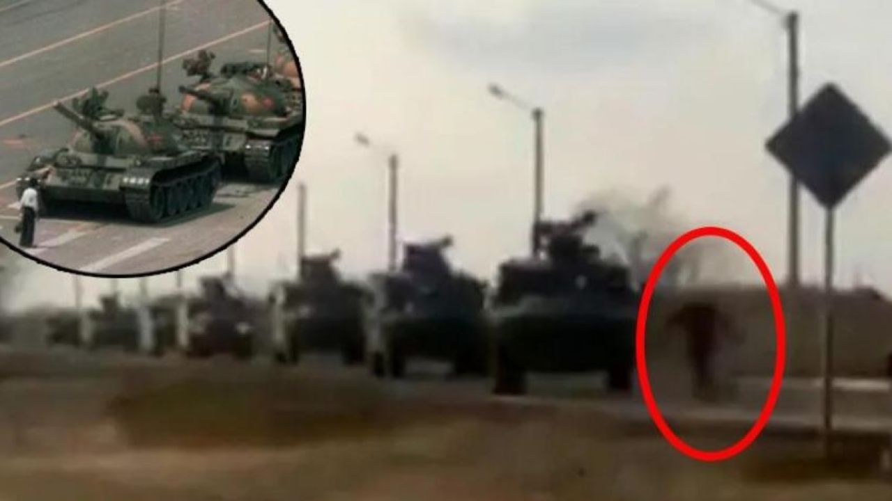 Cesur adamın görüntüsü yıllar önce Pekin Tiananmen Meydanı'ndaki tankların önünde duran, kimliği belirlenemediği için 'Meçhul Asi' diye bilinen adama benzetildi.