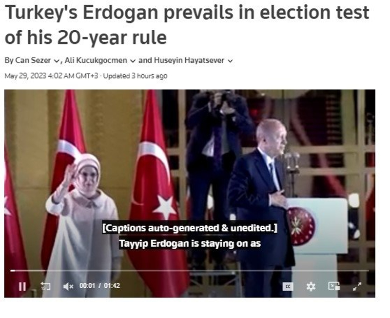 Reuters da seçim zaferinden bahseden gazeteler arasındaydı. Haberde Kılıçdaroğlu ile Erdoğan'ın oy oranları da paylaşıldı.