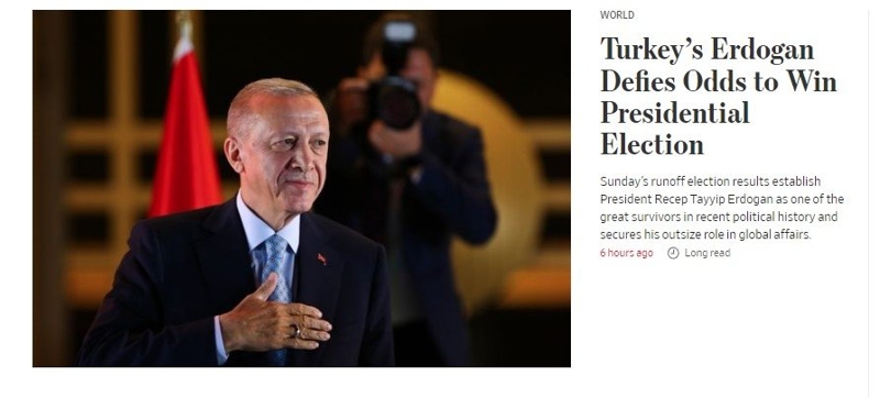 Wall Street Journal da Erdoğan'ın cumhurbaşkanlığı seçimini kazandığını ifade ederek 'oranlara resmen meydan okuduğunu' söyledi. Haberde küresel dengelerin yeniden şekilleneceği de söylendi.