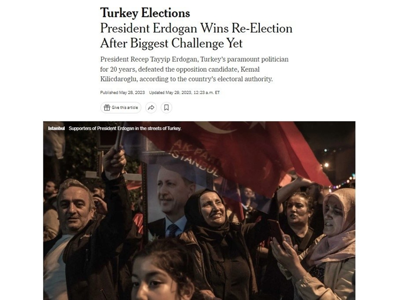 New York Times (NYT), seçimlere internet sitesinde ayrı bir sayfa ayırdı. "Cumhurbaşkanı Erdoğan şimdiye kadarki en büyük zorluğun ardından yeniden seçimi kazandı" başlığı ile verdiği haberinde NYT, "Türkiye'nin 20 yıldır en önemli siyasetçisi olan Cumhurbaşkanı Recep Tayyip Erdoğan, ülkenin seçim otoritesine göre, muhalefet adayı Kemal Kılıçdaroğlu'nu mağlup etti." ifadesine yer verdi.