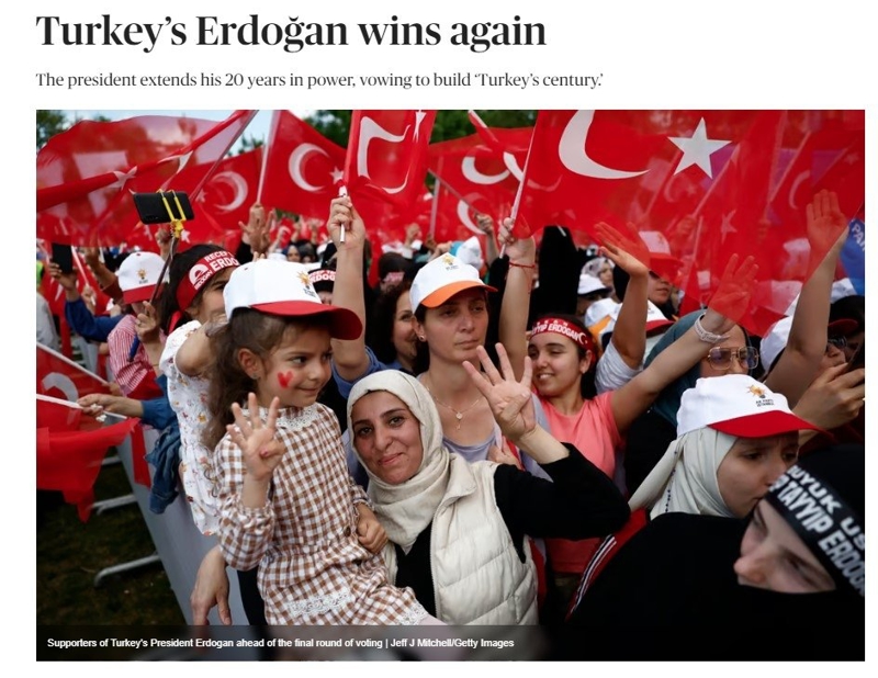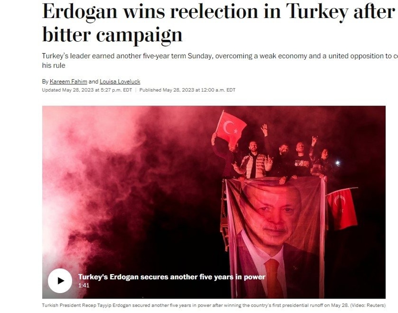Washington Post gazetesindeki bir analizde, Erdoğan'ın, 'birleşen bir muhalefet tarafından desteklenen bir adayın meydan okumasından sağ çıktığı' ifadesi kullanıldı.
