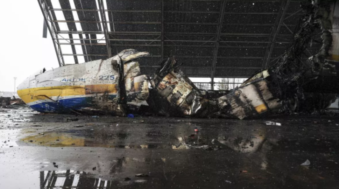 Son iki gün öncesine kadar ağır çatışmaların yaşandığı Gostomel şehrindeki Antonov uçak tesisinde bulunan ve Rusya-Ukrayna savaşının ilk günlerinde Rusya'nın düzenlediği bombardımanlar sonucu ikiye ayrılan "Antonov An-225 Mriya" kendi hangarında bulunuyor.