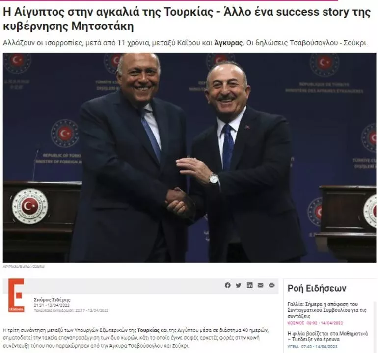 Türkiye ve Mısır arasındaki yeni dönemi yakından takip eden Yunan basını da Çavuşoğlu-Şükri arasındaki görüşmelere geniş yer ayırdı.