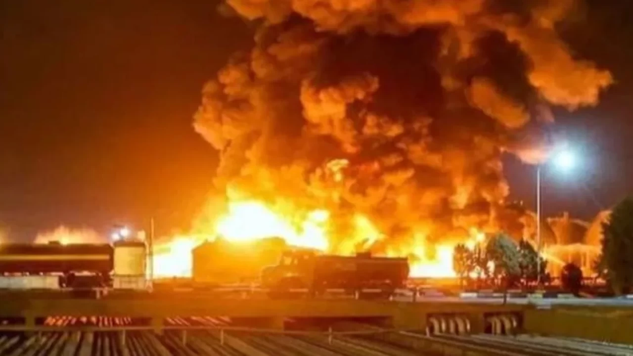 Yerel basına göre, alevler büyük bir patlamaya neden olurken, sosyal medyada yayımlanan videolarda ise yoğun siyah duman sütunları görüldü.