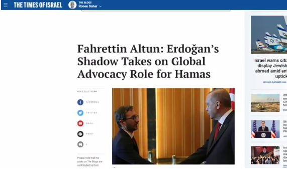 The Times Of Israel'de çıkan "Fahrettin Altun... Erdoğan'ın Gölgesi Hamas için küresel savunuculuk rolü üstleniyor" başlıklı haberde Cumhurbaşkanlığı İletişim Başkanı Fahrettin Altun hedef alındı. Haberde, Altun'un Hamas'ın küresel çapta savunuculuğunu yaptığı iddia edildi. İsrail'in Gazze'deki operasyonlarını gerekçe göstererek Binyamin Netanyahu hükümetiyle gerilimi tırmandıran ve bunu onaylamadığını ifade eden Türkiye Cumhurbaşkanı Recep Tayyip Erdoğan'ın önceki yıllardan farklı olarak perde arkasında yeni bir ismi devreye soktuğu belirtilen haberde, perde arkasındaki bu ismin İletişim Başkanı Fahrettin Altun olduğu ifade edildi. Türkiye'nin İsrail ile ilişkilerinde geçmiş diplomatik krizlerden farklı olarak yeni bir strateji denediğine işaret edilen haberde, "Diplomatik ilişkileri sürdürürken ve İsrail'e herhangi bir somut yaptırım uygulamaktan kaçınırken hem sosyal hem de geleneksel medya aracılığıyla İsrail'e karşı amansız bir ulusal ve uluslararası karalama kampanyası yürütülüyor. " iddiasında bulunuluyor.