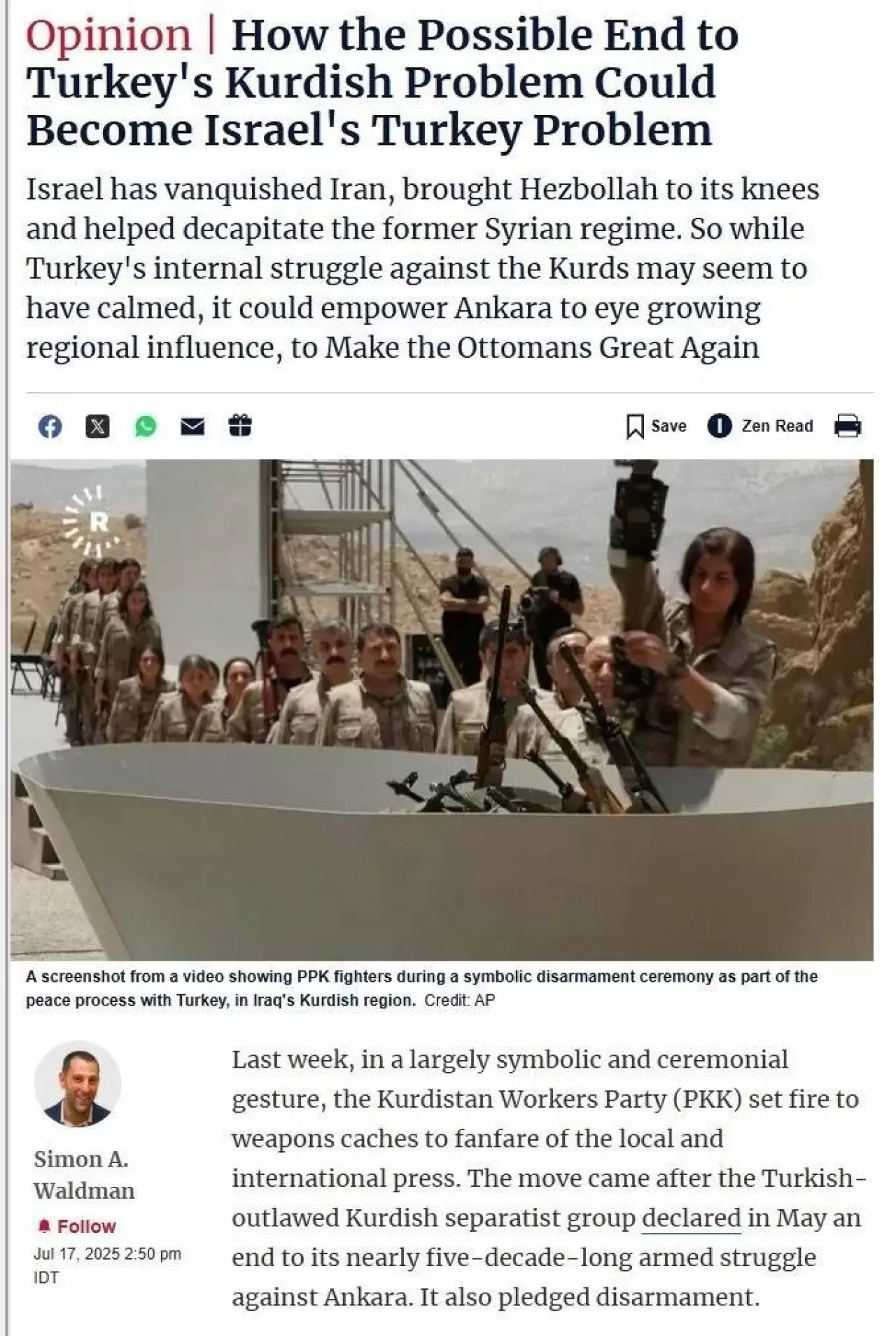 İsrail’in muhalif ve sol-liberal gazetesi Haaretz’de Simon Waldman tarafından kaleme alınan bir yazıda Türkiye’nin Kürt meselesinde olası bir çözüme ulaşmasının, kendileri için yeni bir sorun olabileceğinden bahsetti.